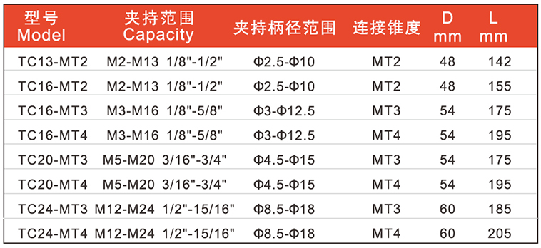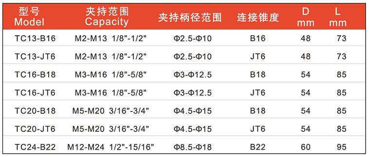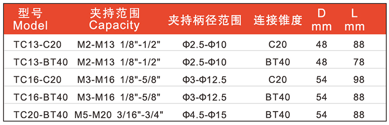 Product performance: the product has an adjustable clamping range, within the clamping range of British, American, Metric and special sizes can be used non-standard tap; the overall use of the goods of high quality materials, the overall quenching, with high precision, high torque, high durability and other characteristics. Scope: commonly used in the "West" brand, such as desktop and pneumatic tapping machine, electric and other types of tapping machine, and can be used for lathes, milling machines, CNC and other rigid tapping. |